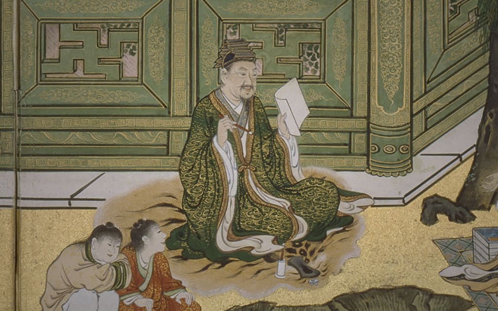 这幅大型屏风画出自江户时代(1603–1867)初期的狩野派画师——狩野山雪(1589–1651)之手。整幅作品由四组八扇屏风构成,分为两对,总长度约14米。屏风上描绘了中国晋代(266-420)著名的“兰亭集会”。彼时,被誉为“书圣”的著名书法家王羲之邀请名士前往兰亭,众人沿着蜿蜒的溪流一边品酒,一边吟诗作赋。兰亭集会的题材在中国和日本的文艺作品中经常出现。