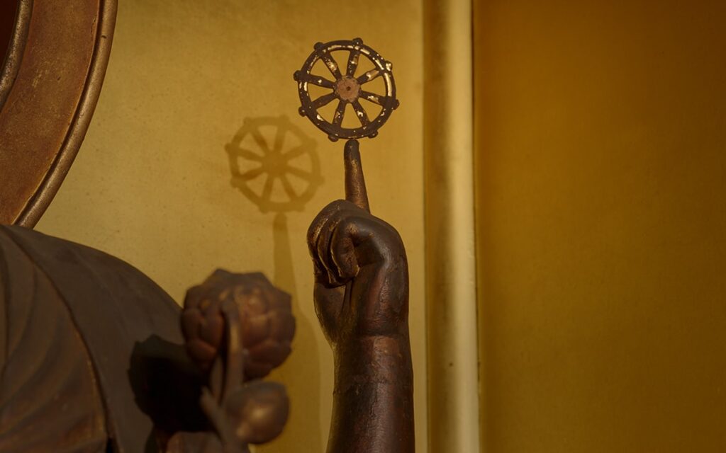 อาวุธขว้างโบราณจากอินเดีย ถูกนำมาใช้ในพระพุทธศาสนาเพื่อเป็นสัญลักษณ์ของคำสอนของพระพุทธเจ้าที่ทำลายล้างความหลงผิดของจิตใจ โดยคำสอนดังกล่าวยังถูกเรียกอีกชื่อว่า “การหมุนวงล้อธรรม” ต่อมาอาวุธขว้างนี้ได้กลายเป็นสัญลักษณ์ของพระพุทธเจ้าศากยมุนี